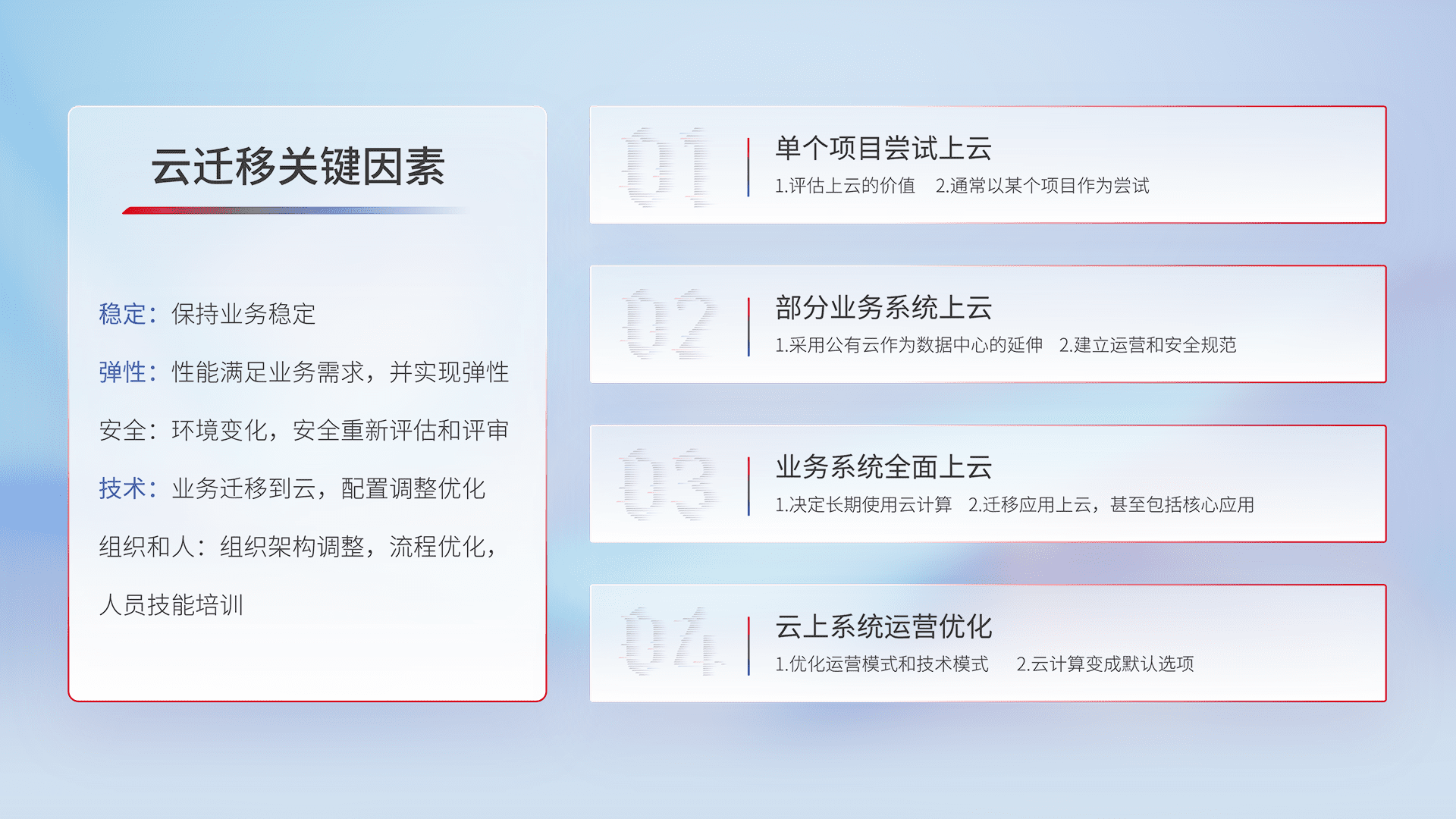 结合实际业务,,,从规划设计、、、云平台选型、、云原生改造、、、数据迁移、、集成交付,,,,迁移全过程为客户识别最佳上云路径,,,做好风险识别管理,,,设计网络架构、、身份权限、、安全审计合规、、、操作审计、、日志审计、、监控告警策略、、多站点容灾设计等,,,对云上基础设施进行整体规划,,,,提升IT治理水平,,,,以满足弹性、、、、高可用、、、高性能的需求。。。。