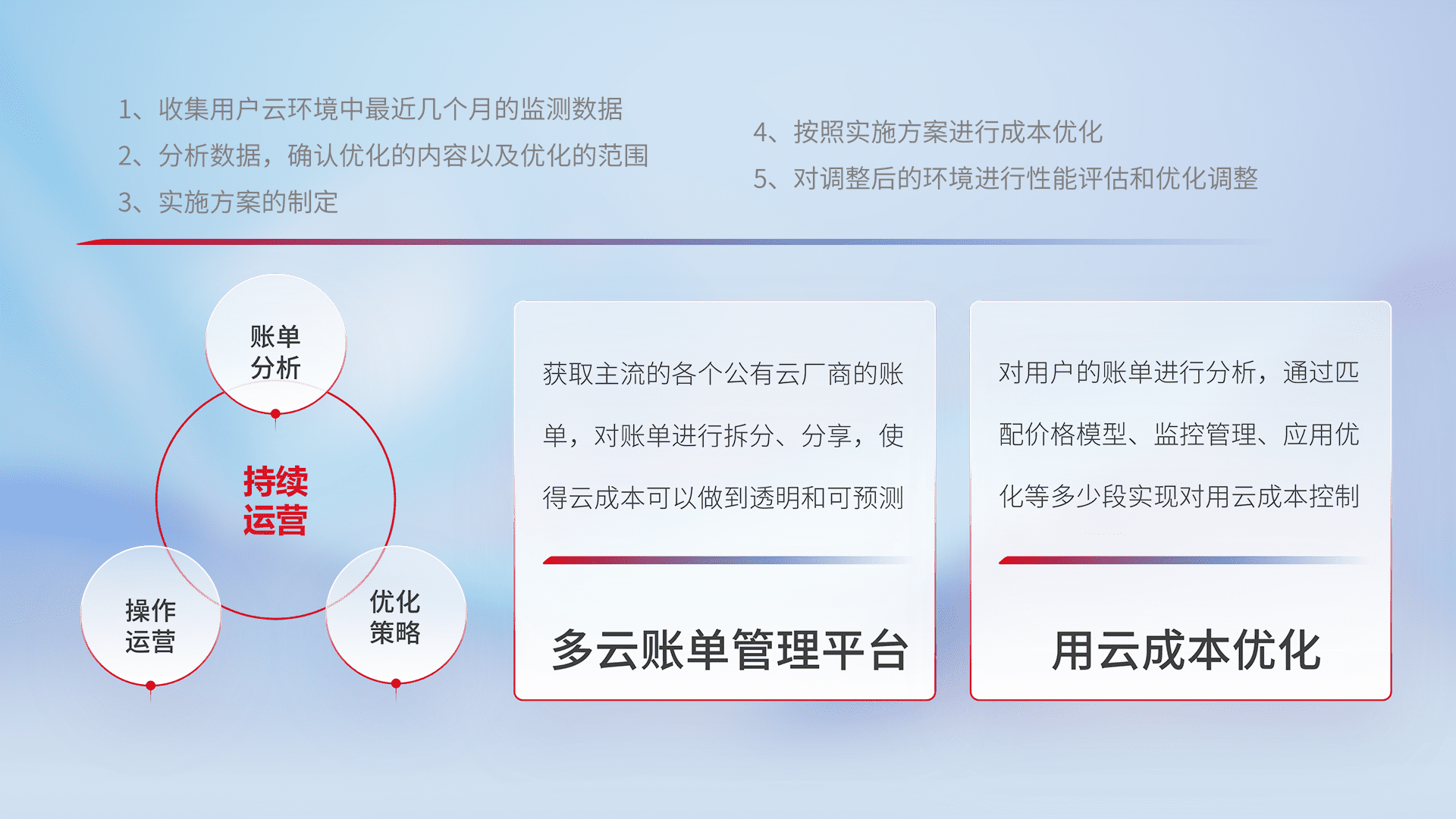 通过多云纳管,,,以统一的资源数据模型把客户的云资源进行抽象和封装,,,进而实现对多云资源的统一操作,,,保障云资源管理的可靠性、、、稳定性与可用性。。。。量身定制化运维内容,,,配置、、、开发运维、、补丁管理、、、、备份、、、监控、、认证和访问管理、、审计和日常巡检等,,保障在用云过程中的可靠度,,,稳定度以及高可用率。。。