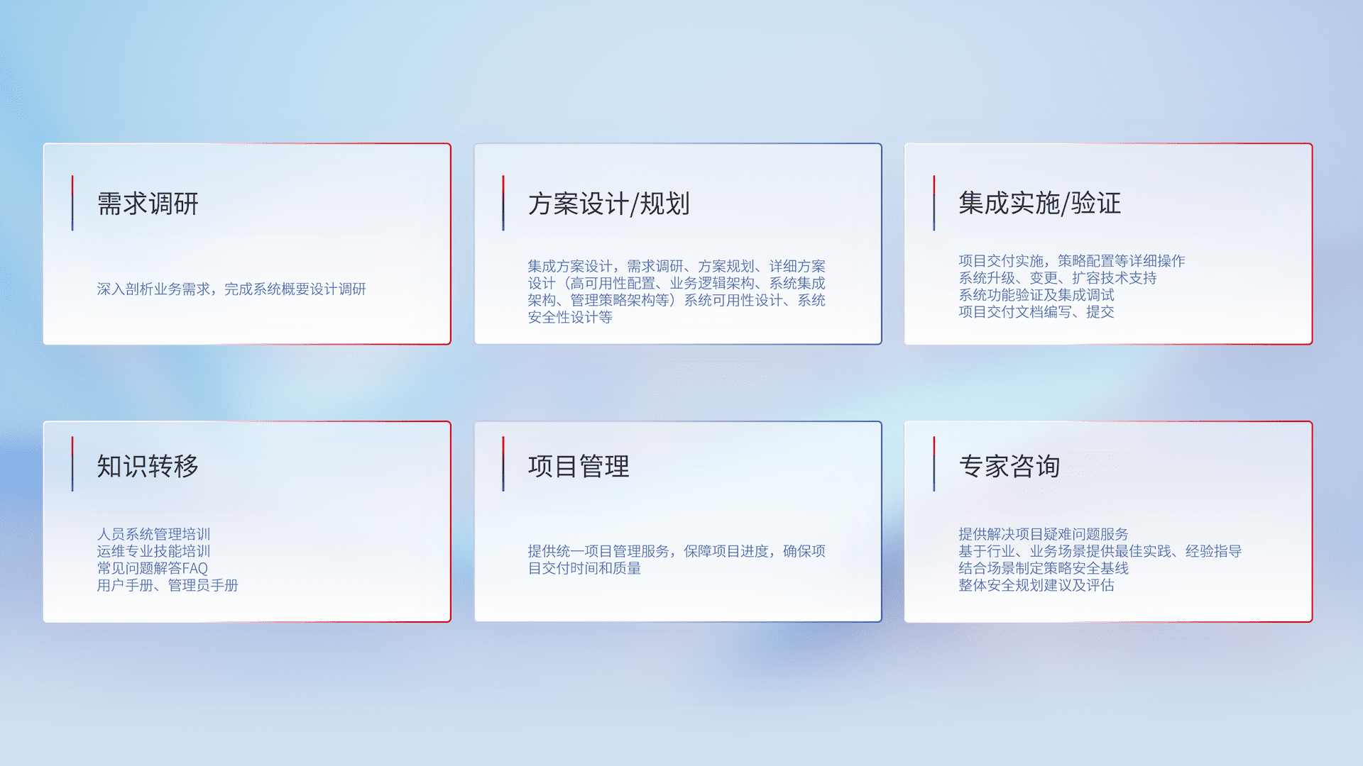 针对客户行业特性,,,将宏观的安全战略和需求,,,,通过专业的交付服务,,,实现项目落地,,,,为客户提供标准规范的集成交付服务。。